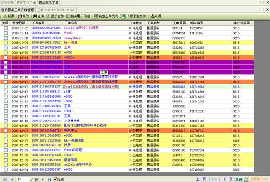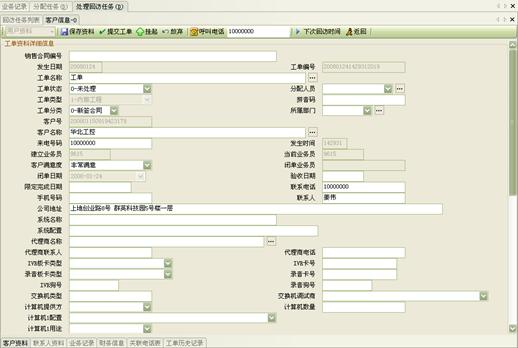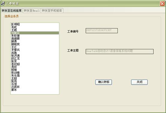3) 工作流閉環(huán)、客戶通話歷史,客戶聯(lián)系歷史,工單流轉(zhuǎn):工作流系統(tǒng)是通過工單實現(xiàn)各工作流環(huán)節(jié)的聯(lián)系以及工作流的定義管理,工作流狀態(tài)查詢、更改的。操作員可根據(jù)用戶的不同業(yè)務(wù)請求,建立相應(yīng)的工單記錄,并對該事后處理過程進行跟蹤;也可對要處理的事務(wù)形成工單轉(zhuǎn)給相應(yīng)的操作員,并跟蹤該工單的處理過程;可定期提示操作員處理要過期的工單,以提高服務(wù)質(zhì)量;每次處理過程都會有詳細的記錄,以便統(tǒng)計查詢 。如圖8、9、10: