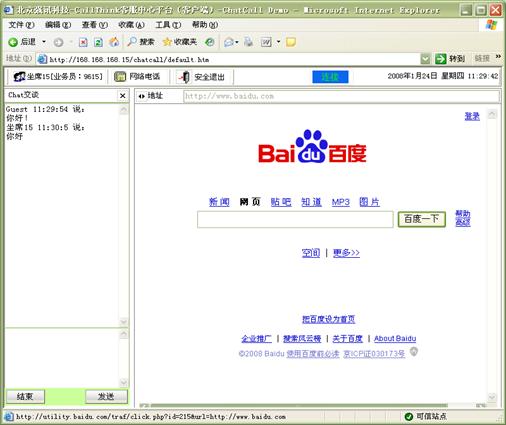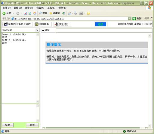 Chart交談:客戶可以選擇通過WEB頁面與座席通過文字的形式進行交談,無需語音通信 ,客戶進入特定的CHAT網(wǎng)頁后,可以選擇一個座席或一組座席進行CHAT交談。如圖12和13所示: