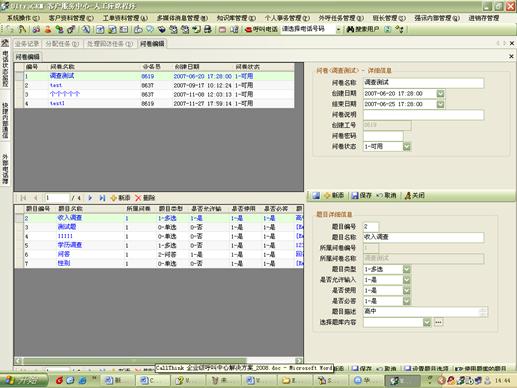 外呼中還可以建立問卷調(diào)查任務(wù)。同時還提供題庫管理、問卷編輯等功能,并且題目之間還可以設(shè)計流轉(zhuǎn)順序。方便使用者靈活設(shè)定問卷內(nèi)容。如圖20、21所示: