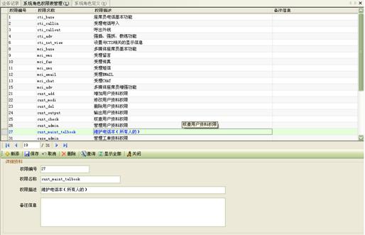 系統(tǒng)設(shè)置了多種對crm系統(tǒng)操作的權(quán)限,如圖27所示。這些權(quán)限方便管理人員根據(jù)坐席的不同情況,工作的內(nèi)容來自由組合這些權(quán)限。
