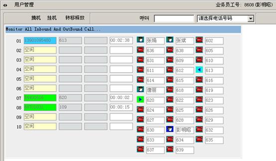 1)系統(tǒng)與CTI服務(wù)器配合,輕松實現(xiàn)諸如:實時監(jiān)控系統(tǒng)的呼叫隊列、登陸坐席的狀態(tài);并且通過屏幕控制電話的接答、掛機、轉(zhuǎn)接,以及建立會議等操作。如圖2: