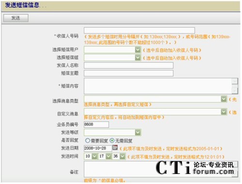 - 群發(fā)短信:通過個(gè)人的Web方式的客戶端給系統(tǒng)預(yù)先設(shè)置好的用戶組或?qū)懭攵鄠(gè)對方手機(jī)號碼發(fā)送短信;