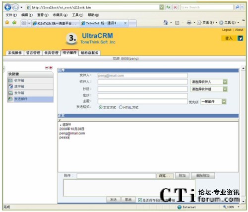 電子郵箱具有與Notes或OutLook相同的功能,可以通過設(shè)定Email服務(wù)的參數(shù),實(shí)現(xiàn)公司內(nèi)部收發(fā)Email,或通過Email服務(wù)器實(shí)現(xiàn)與Internet的通信。