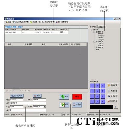 話務(wù)員可以通過點(diǎn)擊鼠標(biāo)進(jìn)行呼叫、應(yīng)答、轉(zhuǎn)接、掛機(jī)、強(qiáng)拆、強(qiáng)插等操作。