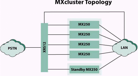 為支持冗余配置蘇迪思科技公司同時(shí)推出新產(chǎn)品XRS12物理連接轉(zhuǎn)換開關(guān)。XRS12可被安裝在19英吋的機(jī)架上,并將占用機(jī)架中的1RU單元。MXcluster集群中每一臺(tái)MX250上的PSTN線路均通過XRS12連接至PSTN網(wǎng)絡(luò)。當(dāng)某一臺(tái)MX250出現(xiàn)故障時(shí),XRS12自動(dòng)將與該臺(tái)MX250對應(yīng)的PSTN網(wǎng)絡(luò)線路轉(zhuǎn)接至備份MX250上。使用XRS12,無需管理員介入操作,即可實(shí)現(xiàn)MXcluster集群與PSTN的不間斷連接。