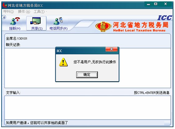 7. 遠(yuǎn)程共享:考慮到對(duì)納稅人電腦的安全保護(hù),座席端沒(méi)有權(quán)利主動(dòng)共享納稅人的桌面,即坐席不能點(diǎn)擊共享按鈕,如果點(diǎn)擊,將彈出對(duì)話(huà)框友好提示:“您不是納稅人,無(wú)權(quán)執(zhí)行此操作”如下圖: