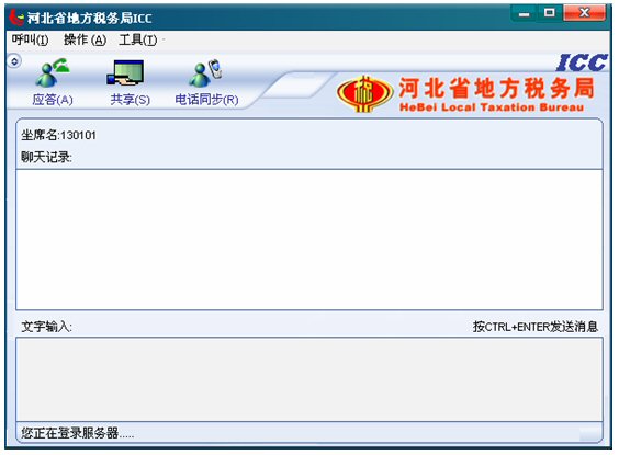 2. 點(diǎn)擊12366界面下面一行按鈕中的ICC按鈕,運(yùn)行起來(lái)ICC。出現(xiàn)ICC界面,此時(shí)ICC處于登錄服務(wù)器狀態(tài),左下角的狀態(tài)欄有文字提示“您正在登錄服務(wù)器……”。聊天記錄對(duì)話(huà)框的上面有坐席名,例如“坐席名:130101”如下圖: