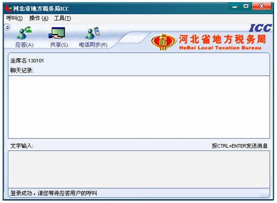 3. 稍等片刻,ICC登錄成功,此時(shí)坐席就可以等待納稅人的呼叫了,左下角狀態(tài)欄有文字提示“登錄成功,請(qǐng)等待應(yīng)答用戶(hù)的呼叫”。如下圖: