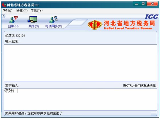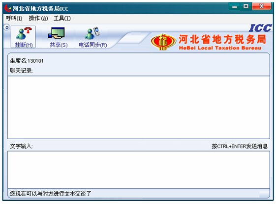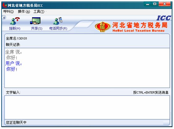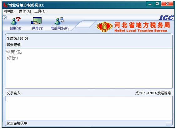 輸入文字信息后按CTRL+ENTER就可發(fā)送消息。輸入的文字可以在 ICC界面上面的聊天記錄對(duì)話(huà)框中顯示,同時(shí)發(fā)送給納稅人。如下圖: