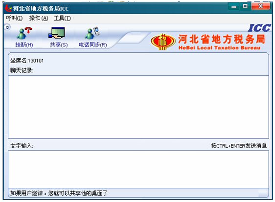收到納稅人共享請(qǐng)求提示,如果坐席現(xiàn)在為全屏,收到納稅人共享請(qǐng)求,ICC界面將會(huì)自動(dòng)跳到全屏的前端,彈出共享框。如果坐席現(xiàn)在不是全屏,收到納稅人共享請(qǐng)求,任務(wù)欄里ICC對(duì)話(huà)框?qū)⒆詣?dòng)閃爍,彈出共享框。
