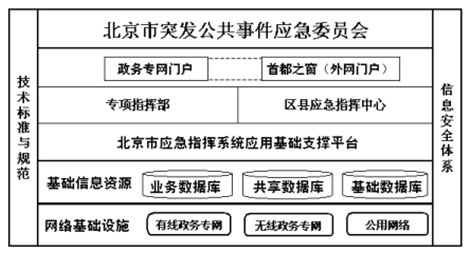 根據(jù)北京市《應(yīng)急指揮系統(tǒng)信息化技術(shù)支撐體系》,北京市的應(yīng)急系統(tǒng)能夠體系結(jié)構(gòu)細化為下圖: