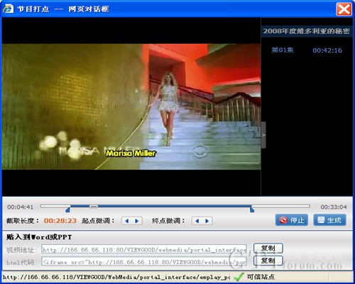 拖動進度條左右的打點按鈕可以設(shè)定片段的開始和結(jié)束時間點,還可以點擊起點微調(diào)和重點微調(diào)的左右箭頭對截取的視頻進行微調(diào),然后點擊“生成”,再點擊“復(fù)制”可以將截取的節(jié)目URL粘貼到WORD、PPT、BBS或BLOG等頁面中。