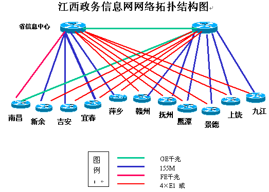 江西省于2002年8月開始實施省政務信息網(wǎng)縱向網(wǎng)省市聯(lián)網(wǎng)工程,于2002年12月底實施完畢。目前,在南昌地區(qū)已建成省級政務核心網(wǎng)及政務專網(wǎng),省委、省政府、省人大、省政協(xié)及一百多個省直部門,已通過光纜實現(xiàn)了橫向網(wǎng)絡互聯(lián)。