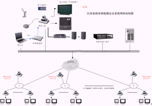 視頻會議工程建設系統(tǒng)承載在寬帶IP網(wǎng)絡平臺上,并與上期工程兼容。網(wǎng)絡結(jié)構采用以省級MCU為中心,級聯(lián)各設區(qū)市MCU,各設區(qū)市MCU連接下屬縣區(qū)分會場視訊終端的兩層星型網(wǎng)絡結(jié)構。11個設區(qū)市會議電視管理中心各放置壹臺MCU、壹臺視訊終端和壹臺會議電視服務器,139個縣區(qū)分會場各放壹臺視訊終端。MCU和視訊終端通過以太網(wǎng)交換機接入傳輸網(wǎng)絡。網(wǎng)絡圖示如下: