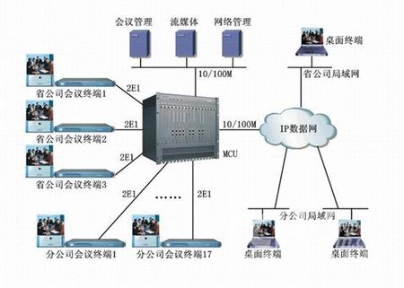 該系統(tǒng)基于蘇州科達(dá)公司KDV系列視頻會(huì)議產(chǎn)品,全網(wǎng)采用1套MCU、20套會(huì)議室型終端和200多套桌面型終端,其中會(huì)議室型終端通過2條E1線路捆綁與MCU相連、桌面型終端通過10/100M以太網(wǎng)和IP數(shù)據(jù)網(wǎng)與MCU相連?傮w網(wǎng)絡(luò)結(jié)構(gòu)如下圖所示: