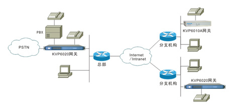 KVP6020采用模塊化設(shè)計(jì),支持FXS、FXO、E&M、E1等多種語(yǔ)音模塊,最大可支持40路FXS用戶接口,可用于總部和大、中型分支機(jī)構(gòu),提供IP語(yǔ)音通信業(yè)務(wù),也可通過FXO、E&M、E1等中繼接口與PBX、與PSTN相連,提供中繼匯接業(yè)務(wù),典型應(yīng)用如下圖。