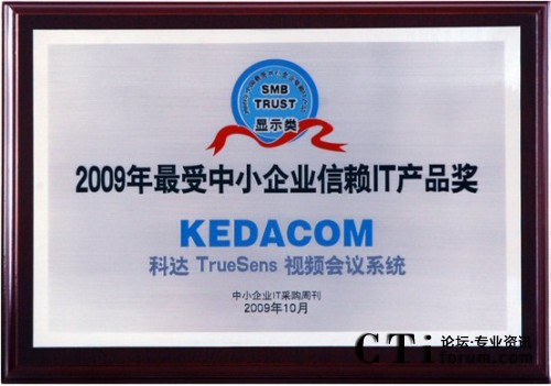 CTI論壇(ctiforum)11月23日消息(記者 潘婷):近日,在剛剛結束的“2009年最受中小企業(yè)信賴IT產(chǎn)品”評選活動中,科達TrueSens(致勝)視頻會議系統(tǒng)憑借卓越的產(chǎn)品性能和良好的服務品質(zhì)在眾多IT產(chǎn)品中脫穎而出,獲此殊榮。