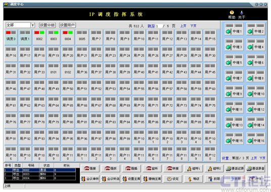 在此界面中實(shí)現(xiàn)了配置管理功能和呼叫相關(guān)功能。配置管理分為:設(shè)置、修改和刪除分組,設(shè)置用戶,設(shè)置中繼,翻頁等功能;呼叫相關(guān)功能:強(qiáng)接、強(qiáng)拆、強(qiáng)插、監(jiān)聽、轉(zhuǎn)接、組呼、設(shè)定等級(jí)、設(shè)定權(quán)限、設(shè)定夜服、會(huì)議相關(guān)等功能。另外,可以在本軟調(diào)度系統(tǒng)中檢索瀏覽相關(guān)通話記錄,并可對錄音進(jìn)行回放。