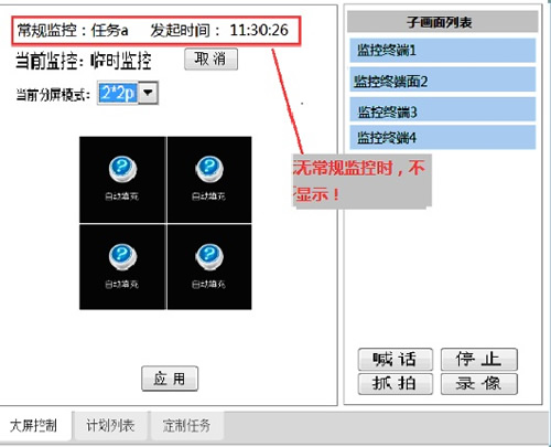 監(jiān)控計(jì)劃規(guī)定了監(jiān)控系統(tǒng)何時(shí)以何種方式在大屏上顯示多個(gè)現(xiàn)場的監(jiān)控畫面。監(jiān)控畫面可輪詢,可調(diào)整設(shè)置畫面分屏顯示模式;可以固定在某位置顯示某監(jiān)控畫面;可以切換到險(xiǎn)情聯(lián)動監(jiān)控模式?梢耘c監(jiān)控畫面喊話;監(jiān)控錄像;保存畫面等功能。
