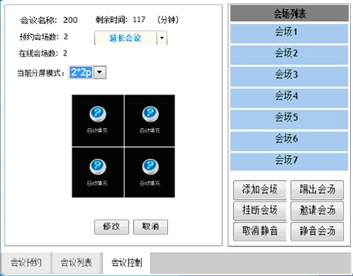 添加一個(gè)會場到當(dāng)前會議當(dāng)中。點(diǎn)擊“添加會場”按鈕,會出現(xiàn)彈屏,雙擊會場完成添加。