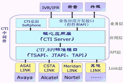 CTI中間件用來(lái)在計(jì)算機(jī)應(yīng)用系統(tǒng)和交換設(shè)備之間充當(dāng)接口作用,起著承上啟下的作用;CT中間件向下提供通用性支持(對(duì)主要交換機(jī)消息接口和符合CSTA標(biāo)準(zhǔn)的交換設(shè)備的支持);向上提供應(yīng)用接口或開發(fā)控件,包括呼叫控制、座席管理以及其他設(shè)備接口等功能,這些是CT中間件的核心功能。但目前CTI中間件已經(jīng)拓寬了該應(yīng)用范圍,CTI中間件還向上延伸了功能,提供了一部分業(yè)務(wù)應(yīng)用和業(yè)務(wù)管理功能,如業(yè)務(wù)系統(tǒng)、監(jiān)控系統(tǒng)、計(jì)費(fèi)系統(tǒng)、呼叫統(tǒng)計(jì)報(bào)表的應(yīng)用。
