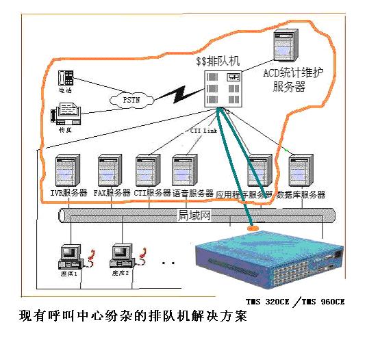 除AVAYA外,目前所有的傳統(tǒng)交換機(jī),都只是個(gè)PBX,用戶(hù)既不能編程,也沒(méi)可編程的CTI技術(shù),只承擔(dān)了系統(tǒng)中一個(gè)很小的排隊(duì)功能(ACD),該解決方案的關(guān)鍵任務(wù)仍然由語(yǔ)音卡+工控機(jī)的平臺(tái)來(lái)完成:IVR、CTI、FAX、錄音等系統(tǒng)的幾乎全部主要功能,因此無(wú)論從成本上還是技術(shù)的領(lǐng)先性、可靠性和穩(wěn)定性,可擴(kuò)展性和可維護(hù)性上,絕不是先進(jìn)的解決方案,而只是基于品牌的導(dǎo)向;而對(duì)于中小企業(yè),更多地去關(guān)心產(chǎn)品的適用性,而根本耗不起品牌。因此,從上圖可分析,傳統(tǒng)排隊(duì)機(jī)的解決方案本身很落后,性?xún)r(jià)比也很低。