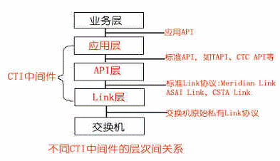 根據(jù)CTI的功能定位,可以把CTI產(chǎn)品劃分為不同的層次,一般地可分為三種類型:Link層產(chǎn)品、API層產(chǎn)品、應(yīng)用層產(chǎn)品,其分層結(jié)構(gòu)示意圖如下所示: