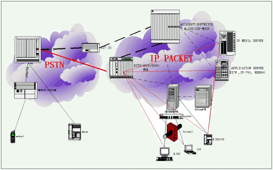 1、可以把裝有eProxy的服務(wù)器看成專用交換機(jī)VoIP switch,它負(fù)責(zé)內(nèi)外電話的接通與斷開(kāi)。如圖: