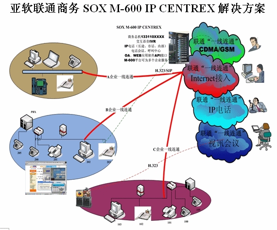 亞軟SOX融合通信解決方案也叫聯(lián)通商務(wù)解決方案,該方案是基于軟交換的可為多個(gè)集團(tuán)用戶提供IP語(yǔ)音解決方案。SOX融合通信解決方案為集群用戶提供了區(qū)別于傳統(tǒng)集團(tuán)內(nèi)部、外部的通信方式,集團(tuán)無(wú)需再購(gòu)置PBX及為其支付維護(hù)費(fèi)用。由于SOX融合通信解決方案是置于IDC托管中心并基于IP軟交換技術(shù),所以沒(méi)有地域限制,具有集群性、可移動(dòng)性等IP通信特征。