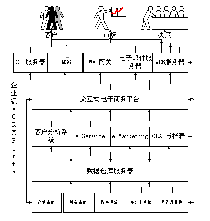 交互式電子商務(wù)平臺:負(fù)責(zé)將企業(yè)內(nèi)部的系統(tǒng)和企業(yè)的電子渠道(如:WEB、電子郵件、WAP、手機短消息和呼叫中心(Call Center)等)與企業(yè)內(nèi)部的業(yè)務(wù)系統(tǒng)(如:銷售系統(tǒng)、ERP系統(tǒng))等連接起來共同為客戶提供更為有效的服務(wù)。