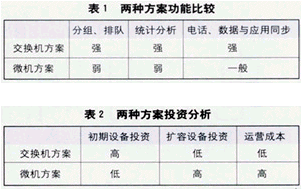 一般來說,最能影響呼叫中心運行能力的功能特征有3個方面:分組排隊功能、統(tǒng)計分析功能以及電話、數(shù)據(jù)與應(yīng)用的同步功能。上述兩種方案比較列于表1和表2。