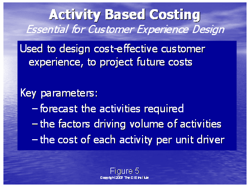圖7說(shuō)明了管理組眼中的傳統(tǒng)的成本可以怎樣分配到各行動(dòng)和成本對(duì)象上去,以至于最后收入的真實(shí)成本可以在不同的客戶(hù)群上得以體現(xiàn)。下面的圖表顯示了以地理劃分的客戶(hù)群,但是很可能分配成本對(duì)象到其它的客戶(hù)群方案里,如人口統(tǒng)計(jì)學(xué)群體,銷(xiāo)售渠道(零售,互聯(lián)網(wǎng),代理)或其它的設(shè)計(jì)客戶(hù)經(jīng)驗(yàn)的有用的種類(lèi)中。