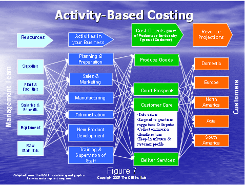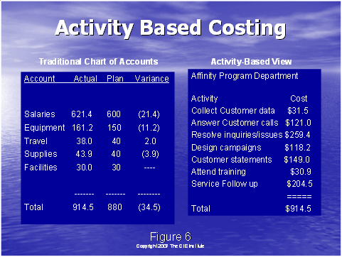 相關(guān)的是,使用傳統(tǒng)的成本和通過(guò)一種系統(tǒng)的合理的方式把該成本分配到各個(gè)行動(dòng)上去。這是它們自身的科學(xué),如果你擁有數(shù)字的頭腦,你可以確定一個(gè)計(jì)劃,該計(jì)劃把企業(yè)的成本分配到圖6右手邊所示的不同的行動(dòng)上去。這是一個(gè)關(guān)鍵的步驟。
