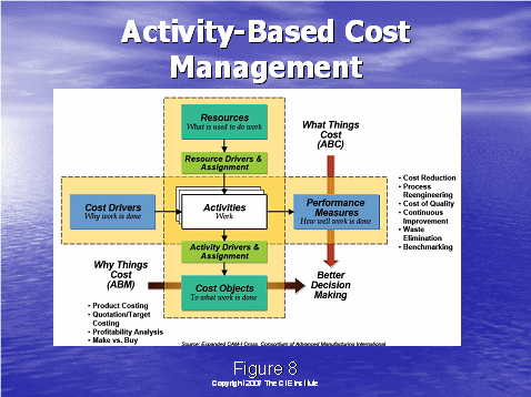 通過(guò)了解圖8,我們將以行動(dòng)成本管理大體是什么的總括作為結(jié)束。我們從左邊的成本驅(qū)動(dòng)因素開(kāi)始——這是做工作的原因,例如:獲得客戶(hù),維持客戶(hù)。就如圖4中所說(shuō)的,這些成本驅(qū)動(dòng)因素可以細(xì)分到工作行動(dòng)上去?梢酝ㄟ^(guò)描述人,培訓(xùn),設(shè)備和技術(shù)資源來(lái)組成工作行動(dòng)。資源驅(qū)動(dòng)因素被用于分配這些企業(yè)成本到各個(gè)行動(dòng)上去。下一步就是系統(tǒng)地確定行動(dòng)驅(qū)動(dòng)因素,分配行動(dòng)成本到成本對(duì)象上去,這有利于決策的制定。例如,獲得一個(gè)客戶(hù)和維持一個(gè)客戶(hù)需要花費(fèi)多少的成本?