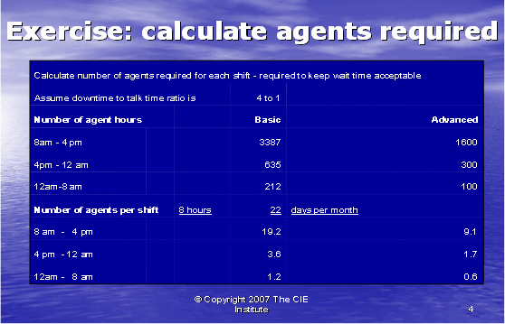 在我們計算出所需的座席數(shù)之前,我們必須了解一個座席的付薪工作時間和他的通話時長的區(qū)別,通話時長是座席真正花在電話上面對客戶的時間。一個座席不會一直處理電話,其它的時間用于培訓(xùn),休息,與主管獨處,部門會議,公司內(nèi)部為給客戶提供準確的回答而進行研究,對內(nèi)對外寫郵件,準備下一個客戶的電話。在每個呼叫中心中,通話時長和停工時長的比率是不同的。對于復(fù)雜易變的產(chǎn)品,花在培訓(xùn)上的時間會更多。在新產(chǎn)品被頻繁介紹的呼叫中心,就需要更多的時間去研究關(guān)于新產(chǎn)品的回答。為了更精確,一個座席一周的工作時長應(yīng)該與其通話時長相比較,以便真正確定通話時長與停工時長的比率。在我們的例子中,我們假設(shè)停工時長和通話時長的比率為4:1,也就是說,每1小時通話時間,相對應(yīng)4小時停工時間。