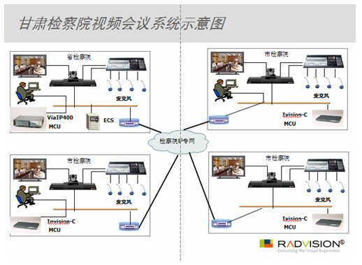為進(jìn)一步提高檢察系統(tǒng)的工作效率,甘肅省人民檢察院已經(jīng)在其現(xiàn)有網(wǎng)絡(luò)的基礎(chǔ)上建設(shè)覆蓋全省范圍的檢察院專用網(wǎng),并致力于在網(wǎng)絡(luò)內(nèi)建成集領(lǐng)導(dǎo)決策、業(yè)務(wù)處理、信息通訊等為一體的信息管理與服務(wù)的綜合業(yè)務(wù)系統(tǒng)和信息系統(tǒng)資源庫,從而建立起一整套可確保全省人民檢察院工作信息化實施和發(fā)展的機制,提高全省檢察機關(guān)的辦公、辦案效率,為檢察機關(guān)全面履行法律賦予的職能提供技術(shù)保障。RADVISION視頻會議系統(tǒng)正是這個宏大計劃的重要組成部分。