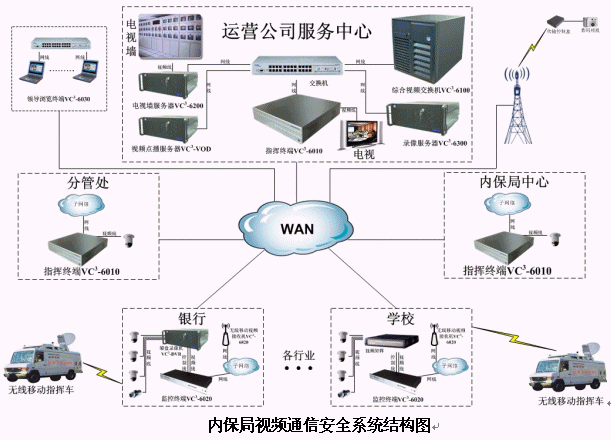 針對以上情況,北京華緯訊電信技術有限公司基于最新推出的VC3-6000綜合視頻通信平臺提出了針對性的"城市安保聯動視頻通信平臺"解決方案。該平臺整合多種資源,實現了視頻指揮調度、遠程視頻監(jiān)控、視頻會議、視頻點播、無線移動視頻接入、高清晰圖片傳輸和環(huán)境監(jiān)測等功能。平臺組成如下圖: