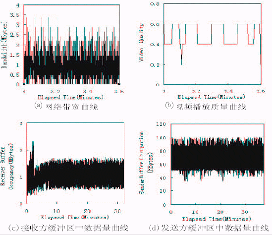 圖3給出了在劇烈的帶寬變化情況下,應(yīng)用該技術(shù)的視頻點(diǎn)播系統(tǒng)所達(dá)到的性能。在圖3中,(a)表示所使用的帶寬情況;(b)表示客戶(hù)端得到的視頻播放質(zhì)量;(c)和(d)分別表示在播放過(guò)程中接收緩沖區(qū)和發(fā)送緩沖區(qū)中的數(shù)據(jù)量情況。對(duì)比圖3(a)(b)可以看出,在網(wǎng)絡(luò)帶寬劇烈變化的情況下,視頻播放質(zhì)量的變化很平緩。由圖3(c)知,接收方緩沖區(qū)沒(méi)有發(fā)生上溢或下溢,這表明客戶(hù)始終能享受到連續(xù)的視頻播放,沒(méi)有出現(xiàn)播放卡殼;也沒(méi)有出現(xiàn)因?yàn)榫彌_區(qū)上溢而丟失從網(wǎng)絡(luò)傳過(guò)來(lái)的數(shù)據(jù)。圖3(d)則表明發(fā)送緩沖區(qū)始終在80k字節(jié)左右,沒(méi)有發(fā)生下溢,說(shuō)明數(shù)據(jù)發(fā)送模塊始終有數(shù)據(jù)可發(fā),即網(wǎng)絡(luò)帶寬得到了充分利用。