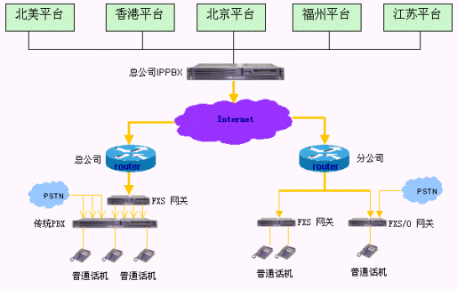 - 建設企業(yè)內(nèi)部的IP電話系統(tǒng),實現(xiàn)企業(yè)內(nèi)部各個分支結(jié)構(gòu)之間的免費通話,即總公司之間、各個分支機構(gòu)之間、總公司與各個分支機構(gòu)之間通訊免費。由于各地電話環(huán)境不同,各個分支機構(gòu)在使用內(nèi)部通話功能時候操作有些差異。
