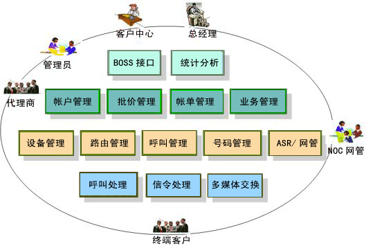 | 呼叫處理 | 設(shè)計(jì)原則: 處理接受終端用戶的呼叫請求。 代理向policy請求呼叫認(rèn)證系統(tǒng) 中每一個(gè)呼叫,負(fù)責(zé)上報(bào)給policy,并接受policy的指示。 功能: 設(shè)備管理:包括:設(shè)備信息管理、設(shè)備號碼管理、用戶的路由策略決定,統(tǒng)計(jì)分析、綜合查詢等等。 路由管理:為管理者全方位地管理系統(tǒng)擁有的路由資源,并對這些資源進(jìn)行開發(fā)提供決策支持。如為不同的客戶不同的要求,提供最適合的路由組合。 呼叫管理:監(jiān)控系統(tǒng)現(xiàn)在正在進(jìn)行的通話,讓管理者實(shí)時(shí)了解系統(tǒng)當(dāng)前的業(yè)務(wù)狀況。 ASR統(tǒng)計(jì):讓管理員實(shí)時(shí)了解系統(tǒng)的近一段時(shí)間的各類用戶,各路由的接通率,平均通話時(shí)長等。 網(wǎng)管:提供管理員管理每個(gè)設(shè)備的信息,并提供遠(yuǎn)程登錄管理到Internet上任何注冊到系統(tǒng)上的設(shè)備。 帳戶管理:管理系統(tǒng)中的每一個(gè)帳戶,支持多級的帳戶管理。上一級可以依據(jù)權(quán)限對下一級進(jìn)行管理。 批價(jià)管理:為各種帳戶提供與其相適應(yīng)的價(jià)格策略,以最低的成本最有效地激勵客戶。如定制打折,套餐等不同的定價(jià)策略. 帳單管理:為每個(gè)帳戶提供定時(shí)準(zhǔn)確帳單收據(jù)?缮 Word、Excel、txt 等不同格式的帳單明細(xì)報(bào)表和統(tǒng)計(jì)報(bào)表。 業(yè)務(wù)管理:為每個(gè)用戶提供各種不同用戶所需要的業(yè)務(wù),并能快速的提供新的業(yè)務(wù)。如呼叫轉(zhuǎn)移,呼叫等待等業(yè)務(wù)。 |