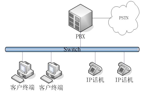 - 簡單網絡結構:一般適用于小型企業(yè)或企業(yè)內某個部門的網絡結構。內部通訊在一個網段內,外部通訊通過一臺PBX交換。