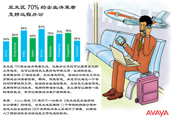 Avaya委托IDC進行了一次題為《亞太地區(qū)企業(yè)移動辦公調(diào)查》的研究,對亞太地區(qū)11個主要市場的跨國公司和當(dāng)?shù)卮笮推髽I(yè)的約2000名高級決策人員進行了調(diào)查,以便深入了解移辦公技術(shù)對該地區(qū)工作造成的影響。