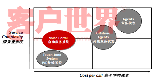 讓我們來看看這張圖。這張圖縱軸是服務(wù)的復(fù)雜度,橫軸是單位呼叫成本,傳統(tǒng)的IVR(觸鍵的語音IVR)和人工服務(wù)相比,服務(wù)的復(fù)雜度可就差多了。而Voice Portal的概念是用比較少的成本做更多的業(yè)務(wù),從成本上講比原來的傳統(tǒng)的IVR可能成本稍微高一點(diǎn)點(diǎn),但是和人工服務(wù)相比,無論是和單位自建呼叫中心座席比,還是和外包呼叫中心座席比,成本都有很大降低,但業(yè)務(wù)復(fù)雜度可以做得比傳統(tǒng)IVR復(fù)雜很多。我們承認(rèn),就提供服務(wù)的內(nèi)容來講,Voice Portal今天仍然不能夠像人工那樣提供那么全面的服務(wù),但是可以涵蓋很多服務(wù)內(nèi)容,在這方面一是因?yàn)榧夹g(shù)先進(jìn)了,另一方面也在于引導(dǎo)。今天我看到越來越多的客戶已經(jīng)開始有意識(shí)的推行自助服務(wù)形式。我前幾年去新加坡打出租,發(fā)現(xiàn)在新加坡有很多叫出租的車站,車站上有一個(gè)按鍵,按鍵上有一個(gè)編碼,說明你在什么位置,當(dāng)你打通出租車客服的電話,你只要告訴這個(gè)編碼,他們就自然而然知道你在什么地方,并把要來接你的車車牌號(hào)通過語音報(bào)讀方式通知你。今天在中國也開始有這種形式了。昨天我沒有開車,也算是支持北京市每周少開一天車的號(hào)召,我打了出租,在和出租司機(jī)聊天的過程中,出租司機(jī)說現(xiàn)在油價(jià)很貴,他們有很強(qiáng)烈的需求不愿意掃馬路,他們也有一個(gè)出租車叫車電話,那個(gè)呼叫中心大概有上百個(gè)坐席,這個(gè)公司有一萬六千輛出租車在北京,由他們來進(jìn)行搶答,搶答完之后你可以告訴說這個(gè)人在什么地方等,唯一不同的我們在自助化上還沒有做得那么到位,司機(jī)搶到了活還要給客戶打一個(gè)電話,不象新加坡完全是自助的,你只要按了那個(gè)鍵,系統(tǒng)就知道你在什么地方,當(dāng)尋找到合適的車的時(shí)候,語音報(bào)讀你車牌號(hào)就行了。我和說出租車師傅,那你打電話成本不是增加了嗎,他一笑,增加打一個(gè)電話的成本怎么也比掃馬路強(qiáng)。大家可以看看呼叫中心多有用,自助服務(wù)能省多少錢。