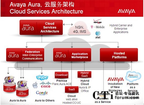 - 當(dāng)其他廠商還在爭論公有云和私有云的優(yōu)劣時,Avaya已經(jīng)開始部署企業(yè)的私有云—Avaya Aura 和運營商的公有云之間如何和諧共處;企業(yè)用戶的統(tǒng)一通信功能完全基于”按需服務(wù)激活”模式;