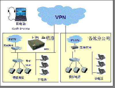 虛擬辦事處/分公司: 企業(yè)沒(méi)有常駐辦公機(jī)構(gòu)的地區(qū),可以通過(guò) IPX 系統(tǒng)將用戶的電話咨詢通過(guò) INTERNET 傳輸?shù)娇偛刻幚。?dāng)?shù)卦O(shè)置一套網(wǎng)絡(luò)電話終端