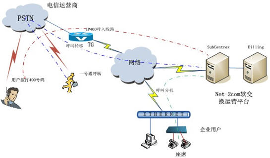 - 普通用戶通過固話、移動電話撥打400號碼,話務通過電信網(wǎng)中繼網(wǎng)關IP網(wǎng)軟交換平臺,由軟交換平臺為400號碼制定被叫實體終端;