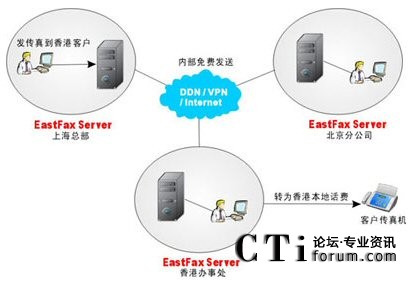 在上圖中,某集團(tuán)公司總部位于上海,在北京、香港有分支機(jī)構(gòu),與分支機(jī)構(gòu)及客戶之間經(jīng)常有大量的傳真往來。目前三個(gè)地方已通過VPN實(shí)現(xiàn)了網(wǎng)絡(luò)互通,且均安裝了EastFax傳真服務(wù)器。