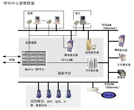 Harris IXP平臺(tái):在本系統(tǒng)中作為交換接入部分,具備R2、SS7、PRI/BRI等多種信令的接入,提供智能ACD分配方案。