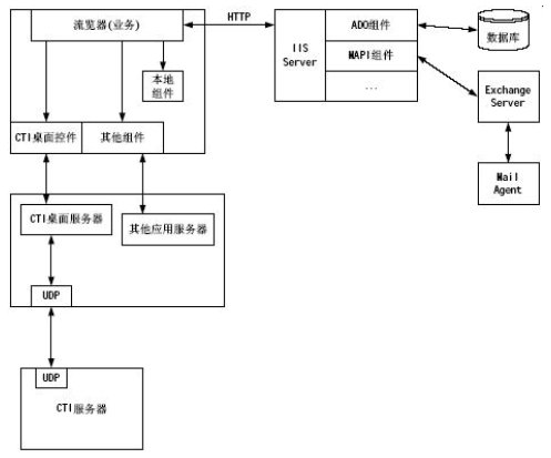 對(duì)于所有的電力業(yè)務(wù)模塊都是在IE瀏覽器上實(shí)現(xiàn),瀏覽器上的應(yīng)用模塊對(duì)WEB Server發(fā)出請(qǐng)求,WEB Server解釋運(yùn)行ASP程序,利用ASP創(chuàng)建數(shù)據(jù)庫(kù)組件訪問系統(tǒng)的數(shù)據(jù)庫(kù)信息;利用嵌入WEB頁(yè)面的CTI桌面控件可以實(shí)現(xiàn)CTI集成功能,如:建立呼叫、應(yīng)答呼叫、席間轉(zhuǎn)移、人工自動(dòng)切換等等;利用其他嵌入WEB網(wǎng)頁(yè)的組件實(shí)現(xiàn)其他擴(kuò)展功能,如:Exchange