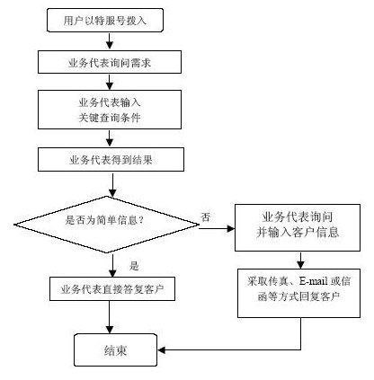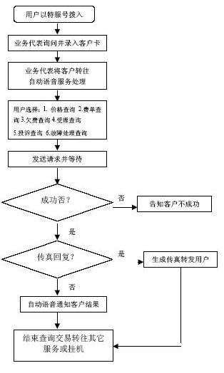 系統(tǒng)自動(dòng)報(bào)受理人員工號(hào),人工交互式受理方式。受理人員根據(jù)用戶要求從服務(wù)質(zhì)量標(biāo)準(zhǔn)數(shù)據(jù)庫(kù)、電費(fèi)數(shù)據(jù)庫(kù)和其他相連的數(shù)據(jù)庫(kù)查詢資料,然后通過語(yǔ)音方式播報(bào)資料或送到用戶指定的傳真機(jī)或其他終端設(shè)備上。主要內(nèi)容如下: